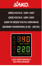 | SAKO | WVR-5000 VA | 140-260 V | 50 Hz | 220 V +-%10 | 50 Hz | 25 A | 5000 W | – | 1 |